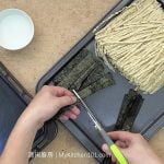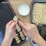 1. 把4张寿司海苔叠上,剪成10条状,再一分为二,共剪成20条,每条约2厘米x10厘米。