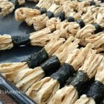 1 把4张寿司海苔叠上,剪成10条状,再一分为二,共剪成20条,每条约2厘米x10厘米。