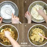 - 把普通面粉、玉米淀粉和糖粉混合过筛后拌匀。加入细盐和冷牛油,把牛油搓入粉类中。加入杏仁粉,拌至混合。加入蛋液,拌至混合。
