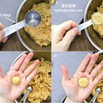 取出½汤匙 (约8克)的粉团,压至紧实后轻轻搓圆。用掌心轻轻按扁,放在已铺上不沾烤盘纸的烤盘上。