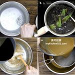2 底层(黑糖层):把300克清水、浓椰浆、碱水、粘米粉、木薯淀粉和绿豆淀粉混合拌匀。把另300克清水、黑糖、盐和香兰叶混合在小锅,加热至滚开。一边搅拌,一边把热黑糖水倒入粉浆拌匀,然后过滤入钢盆里。