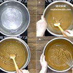 6 依照黑糖粉浆的做法,隔水加热把白色粉浆煮至浓稠后离火,然后继续搅拌至顺滑。