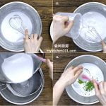 5 上层(白色层):把浓椰浆、盐、粘米粉和绿豆淀粉混合拌匀。一边搅拌,一边加入热水拌匀,然后过滤入钢盆里。加入煎蕊cendol条拌匀。